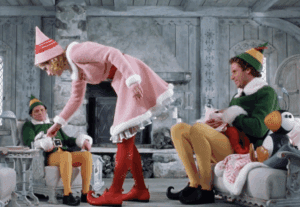 New York City is the perfect backdrop for the film to explore how Buddy’s rather odd upbringing has ill-prepared him for a life amongst non-elves, people who often appear as mean-spirited, jaded, or downright fearful of expressions of joy, kindness, and love, meaning the true spirit of Christmas. But it is in the Big Apple that Buddy also meets and falls in love with Jovie (a blonde Zooey Deschanel), the shy and reticent Gimbels department store clerk who works as an elf at the Christmas display. In the end, it is Jovie, Buddy’s stepmother Emily (Mary Steenburgen), and his half-brother Michael (Daniel Tay) who assist Buddy in saving the day for Santa alongside a chorus (literally) of New Yorkers who must sing Santa Claus is Coming to Town in unison to attain lift off of Santa’s sleigh.