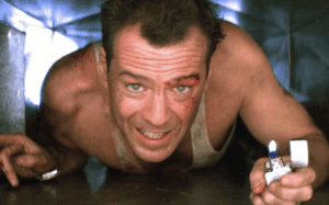Where other action films failed to provide interesting or convincing plots, Die Hard brought a sophisticated layered narrative with a charming, somewhat reckless, and defiant John McClane (Bruce Willis). The movie is fundamentally about a man (New York City cop John McClane) attempting familial reconciliation with his estranged wife, Holly (Bonnie Bedelia), during her corporate Christmas Eve party in a Los Angeles skyscraper, the perfect setting for a terrorist attack led by Hans Gruber (Alan Rickman).